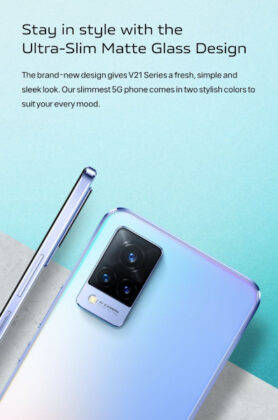 Vivo V21 series India launch is inching close and the lineup is expected to include the Vivo V21 4G and Vivo V21 5G, according to tipster Abhishek Yadav. The tipster has shared promotional images of both phones. The upcoming Vivo V21 will have triple cameras arranged in a square module and a gradient design. The volume rocker and power button are on the right. The front of the phone has a waterdrop notch for the selfie camera and it seems to have two LED flashlights on the top frame. Both the Vivo V21 and V21 5G will have OIS and spotlight support.
