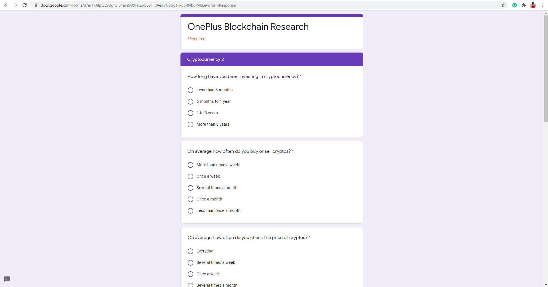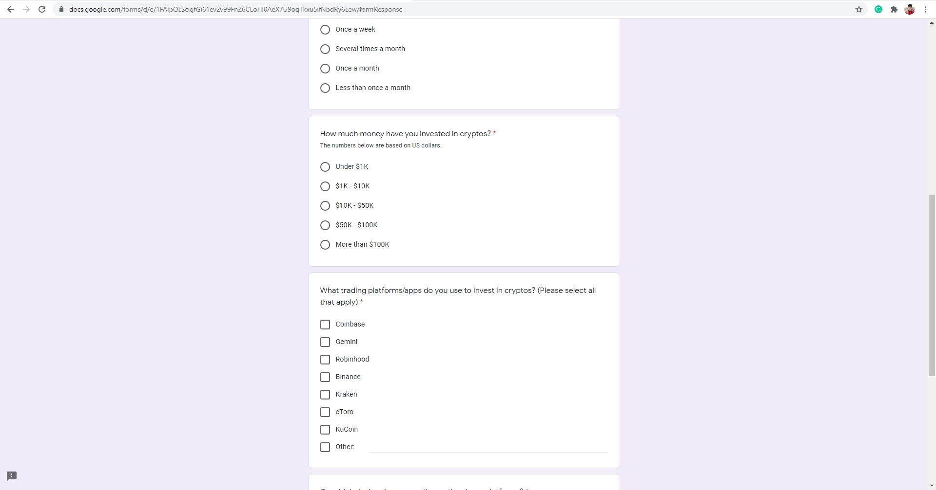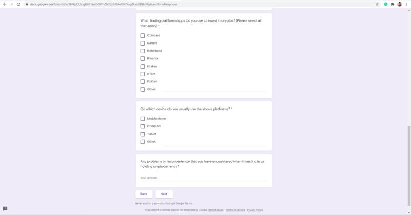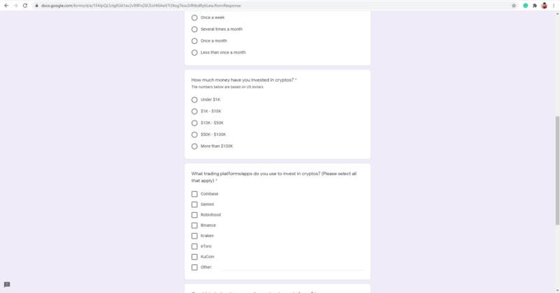 The survey starts by asking you basic information about yourself such as your age, gender, and region. Once you fill in the details, you will be presented with questions related to cryptocurrency such as have you invested in cryptocurrency, how long have you been investing, how much money have you invested so far, and how often do you trade and check prices of cryptocurrencies.