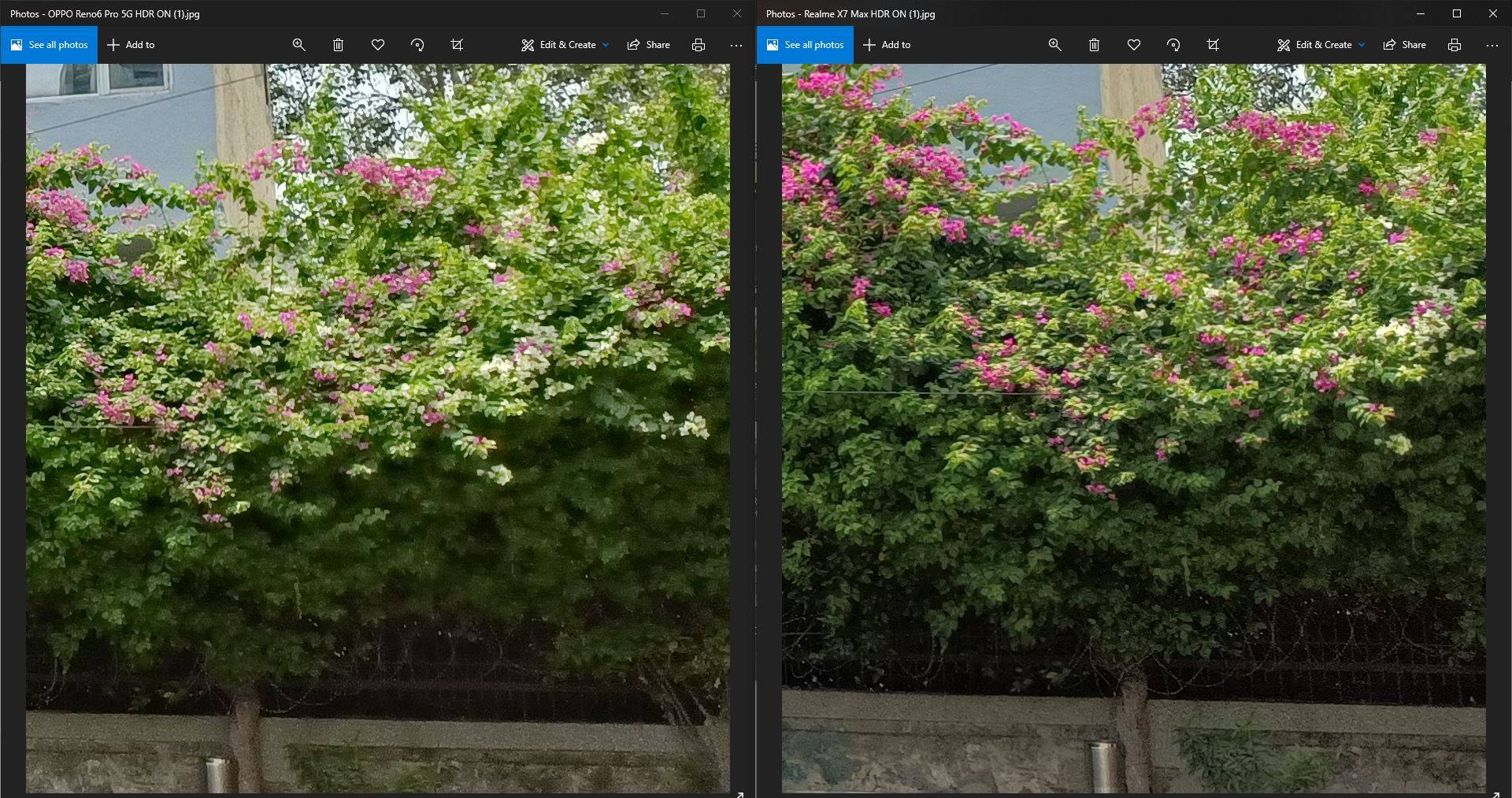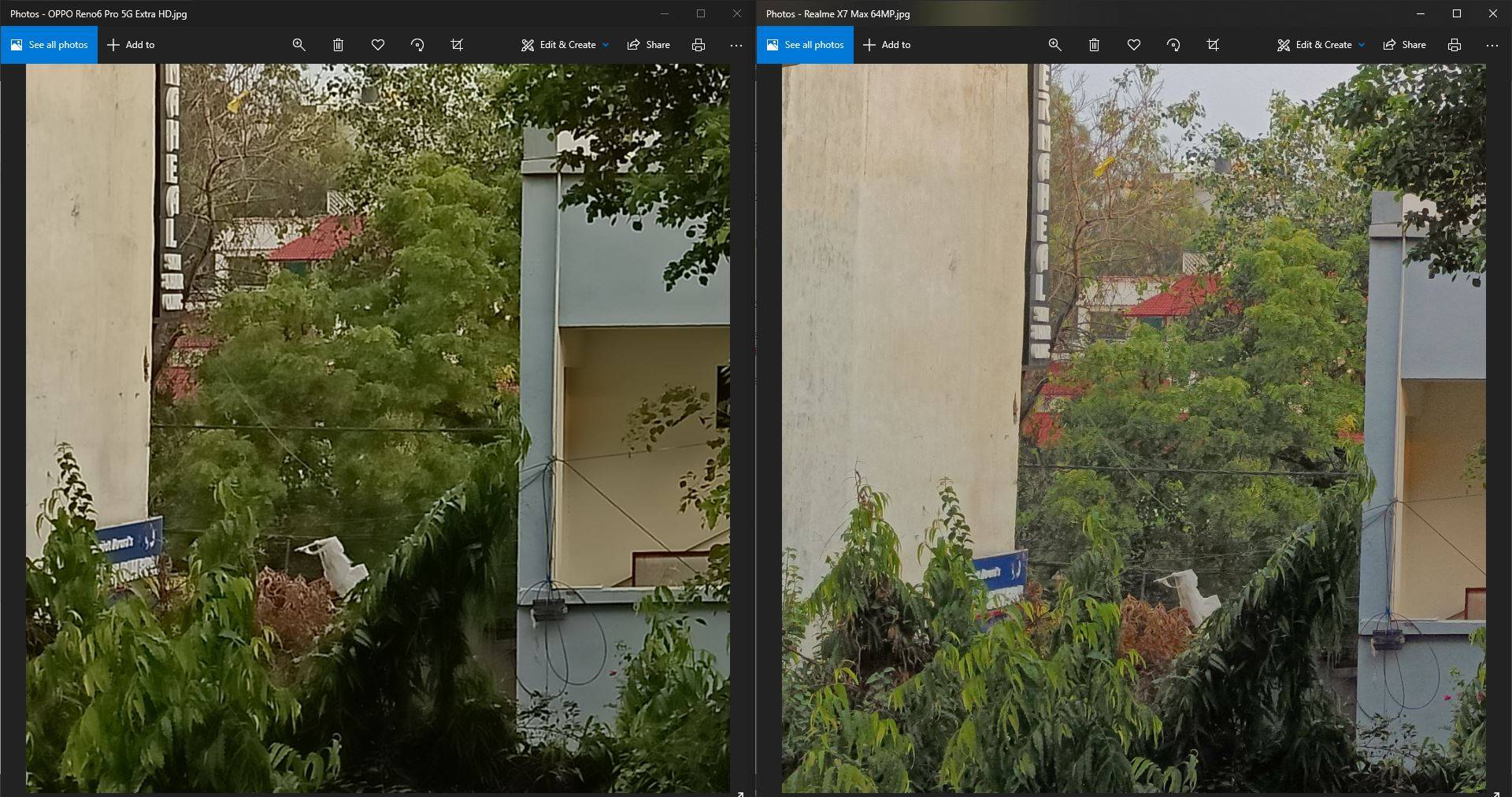 As an example, in the shot attached above, you’ll notice that first and foremost, the X7 Max’s photo has resolved shadows much better. On the flip side, the Reno6 Pro 5G’s photo has a lot of darkened bits near the big tree at the centre. But, upon zooming in, I noticed that the X7 Max’s photo had a ton more detail too. In fact, you can clearly see the details in the leaves, as well as in the tiling of the house with the red roof towards the back in the X7 Max’s photo.