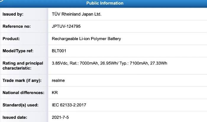 Realme Pad is already confirmed to be in the works by the company at the Realme GT global launched in June. However, the exact launch timeline is yet to be revealed but we can speculate it may arrive before the end of this year. Recently, the alleged Realme Pad live images have surfaced, showing off the front and back design. Now, a new Realme battery with the model number BLT001 has been spotted at TUV Rheinland and DEKRA certification websites with a 7,100mAh battery capacity, courtesy of MySmartPrice. This suggests that we might be looking at the Realme Pad considering no Realme phone is in the works with that battery capacity. Unfortunately, that’s pretty much everything that is revealed from the certifications.