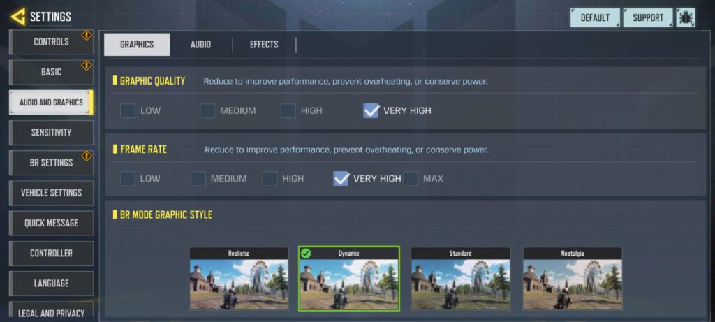 | CoD Mobile | Very High (graphics) + Very High (FPS) / High(graphics) + Max (FPS) |