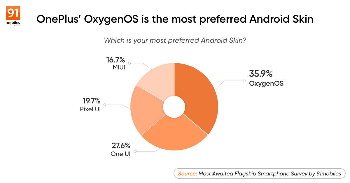 Next, we asked respondents about Android skins they prefer, and in keeping with the general scheme of things so far, it was OxygenOS that got the highest number of votes at 36 percent. OnePlus’ custom Android platform is known for the ease of use, flexibility and customisation features it offers, and is favoured by both newbies as well as power users for these reasons. What’s interesting is that the second most favourite platform wasn’t Pixel UI (which is almost like stock Android), but Samsung’s OneUI which got 28 percent votes. There’s no denying that OneUI has come a long way since the brand’s TouchWiz era. Pixel UI was in third place with 20 percent votes, and Xiaomi’s MIUI was chosen by 17 percent of respondents.