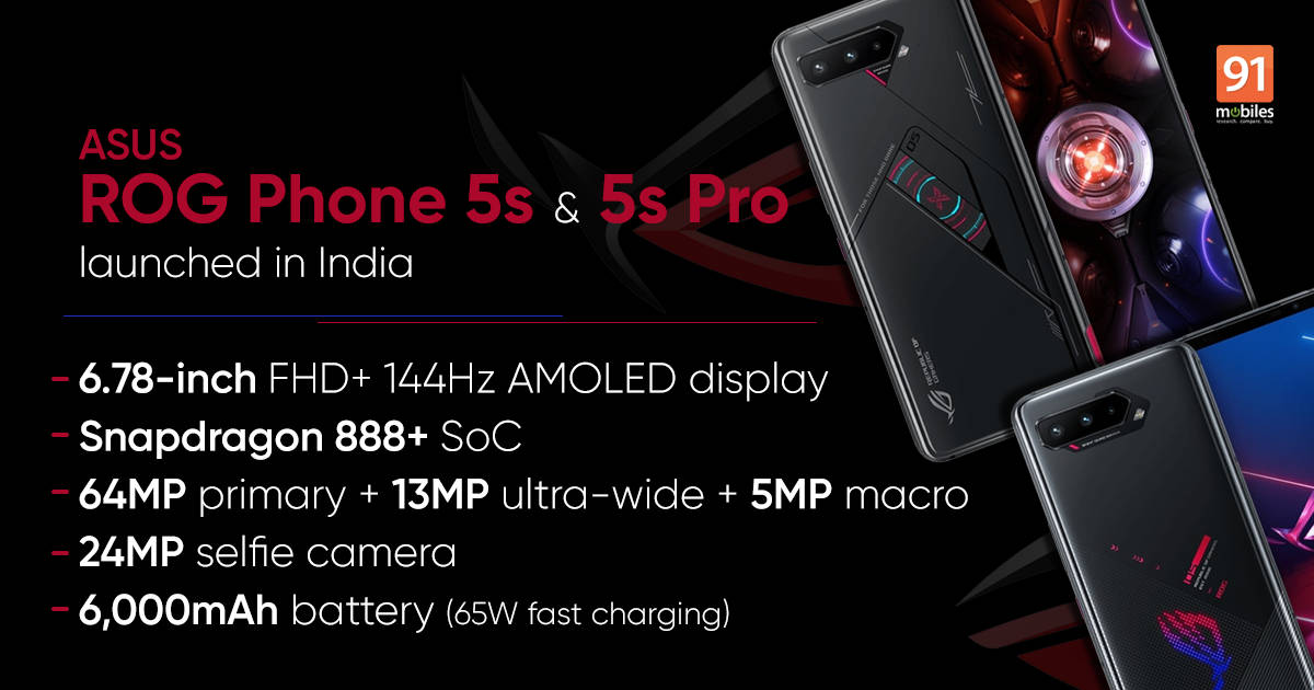 The post ASUS ROG Phone 5s, ROG Phone 5s Pro launched in India with Snapdragon 888+, 144Hz AMOLED display, 6,000mAh: price, specifications first appeared on 91mobiles.com.