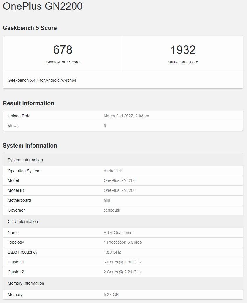 An earlier leak suggests that OnePlus Nord CE 2 Lite flaunts a 6.59-inch fluid full-HD display. Like a typical Nord smartphone, the OnePlus Nord CE 2 Lite is likely to support a 90Hz refresh rate. The Geekbench listing of the OnePlus GN2200 reveals a Qualcomm Snapdragon 695 with a clock speed of up to 2.21GHz paired with Adreno 619 GPU and 6GB RAM powers the device. It boots Android 11 out of the box.