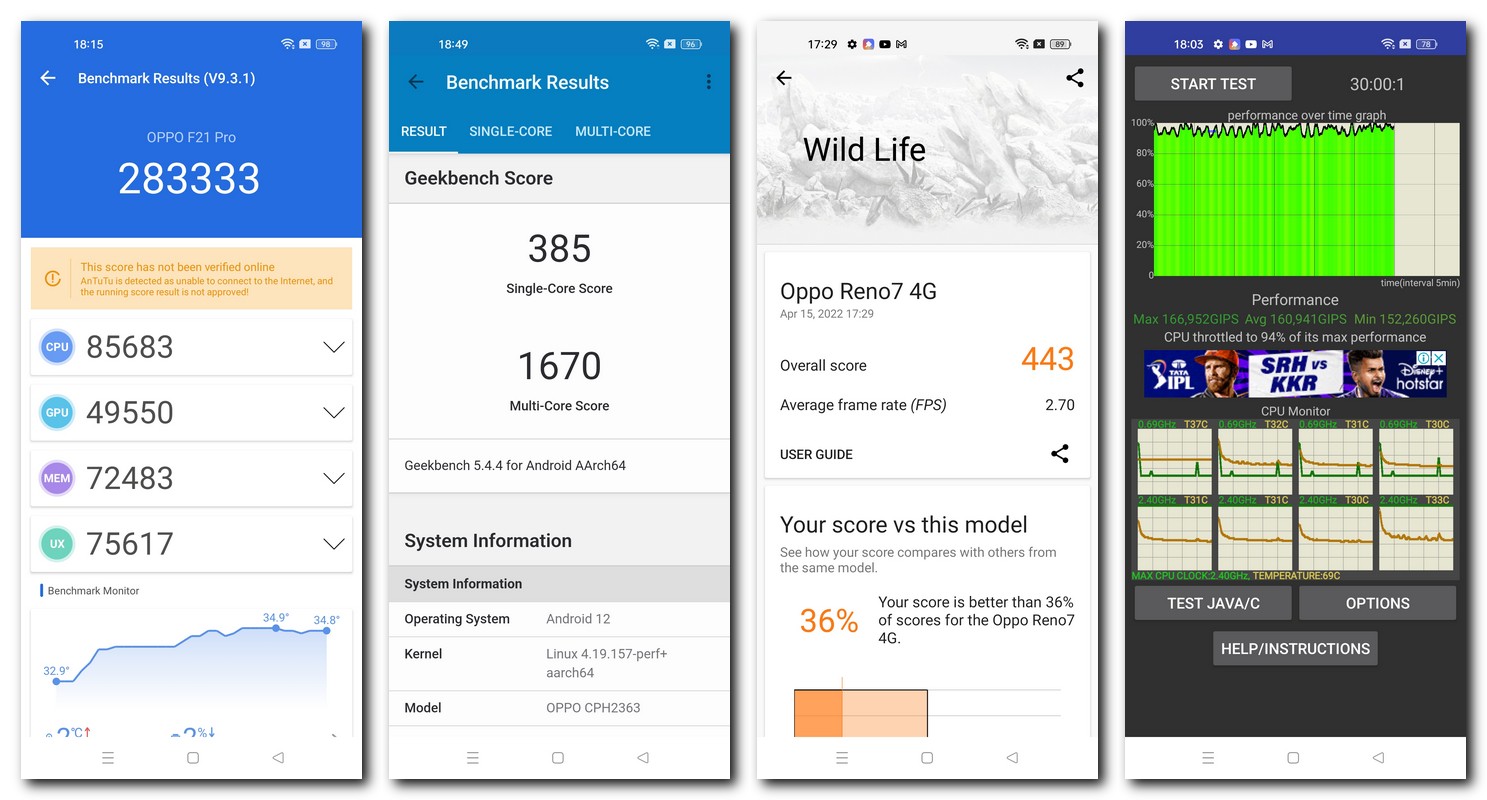 The OPPO F21 Pro runs on the Qualcomm Snapdragon 680 platform which, as prefaced previously, can be found powering phones priced under Rs 15K. Understandably, the handset isn’t the quickest device in its price segment. For instance, in Antutu V9.3 synthetic benchmark, the device outputted a modest score of just 283,333 points. Similarly, the handset yielded 1,670 points in Geekbench 5’s multi-core test, which falls a bit shy of the scores from competing devices too. As for gaming, the phone maxes out at Balanced graphics in BGMI, and buyers looking to get at least 30FPS on the set will have to tone down the graphics preset to the “Smooth” option. That said, the device is more than capable of handling the user’s day-to-day workload, including juggling a handful of apps in memory, as well as browsing the web or using the phone to watch movies/TV shows or clicking a truckload of photos. It also helps that the OPPO F21 Pro ships with oodles of RAM, with the top-end variant offering 8GB of LPDDR4X memory and up to 128GB of internal storage.