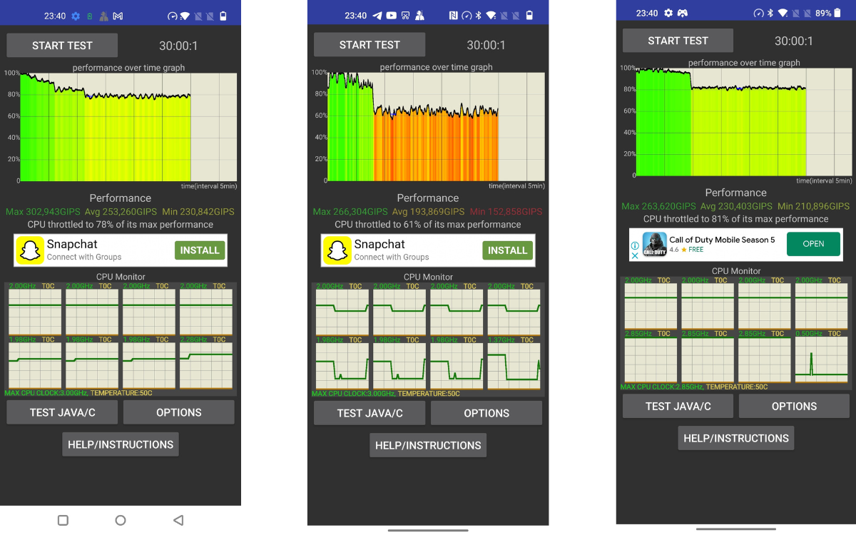 It goes without saying that the faster the CPU, the more heat it’ll like dissipate when delivering its peak throughput. Thankfully, most new-age MediaTek chipsets keep thermal throttling at bay. Take the Dimensity 8100 SoC, for instance, which throttled to just 81 percent of its peak performance and that’s despite being subjected to 20 threads for a period of 30 minutes in the CPU throttle test. The Nord 2, on the other hand, throttled to just 78 percent. In fact, the handset outputted the highest instructions per second too.