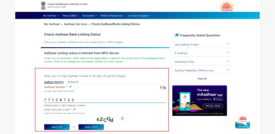 - It will show you whether your Aadhaar card is mapped to your bank account or not.