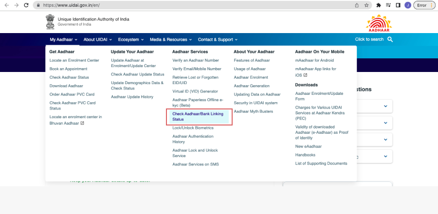 - Click on “Check Aadhaar/ Bank Account Linking Status” in the “My Aadhaar’ tab.