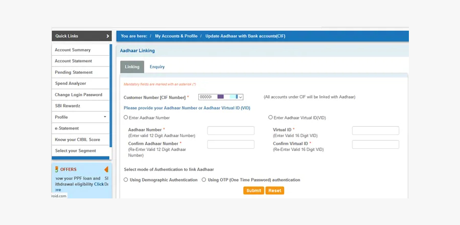 Linking Aadhaar with SBI bank account Via SBI Website
