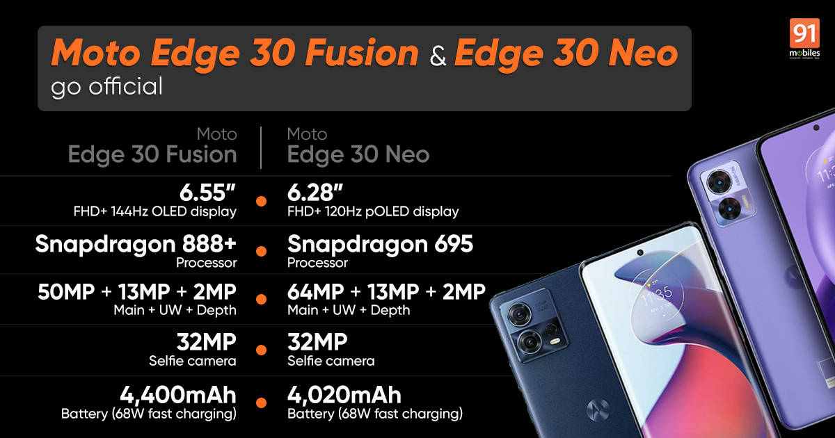 The post Moto Edge 30 Fusion, Moto Edge 30 Neo with Snapdragon chipsets, 68W fast charging launched: price, specs first appeared on 91mobiles.com.
