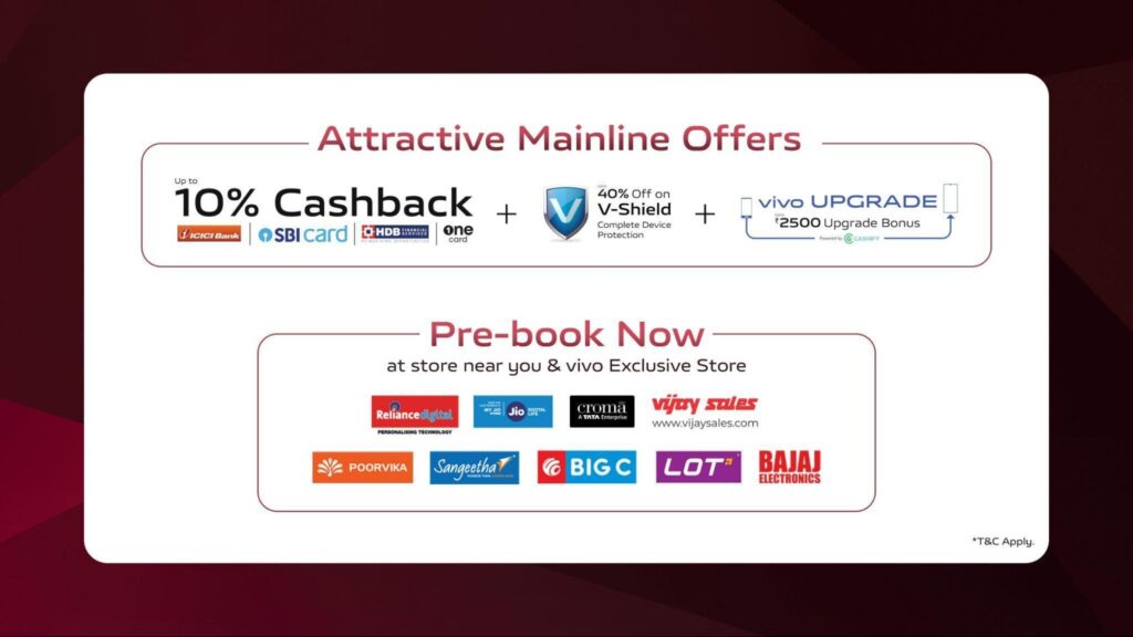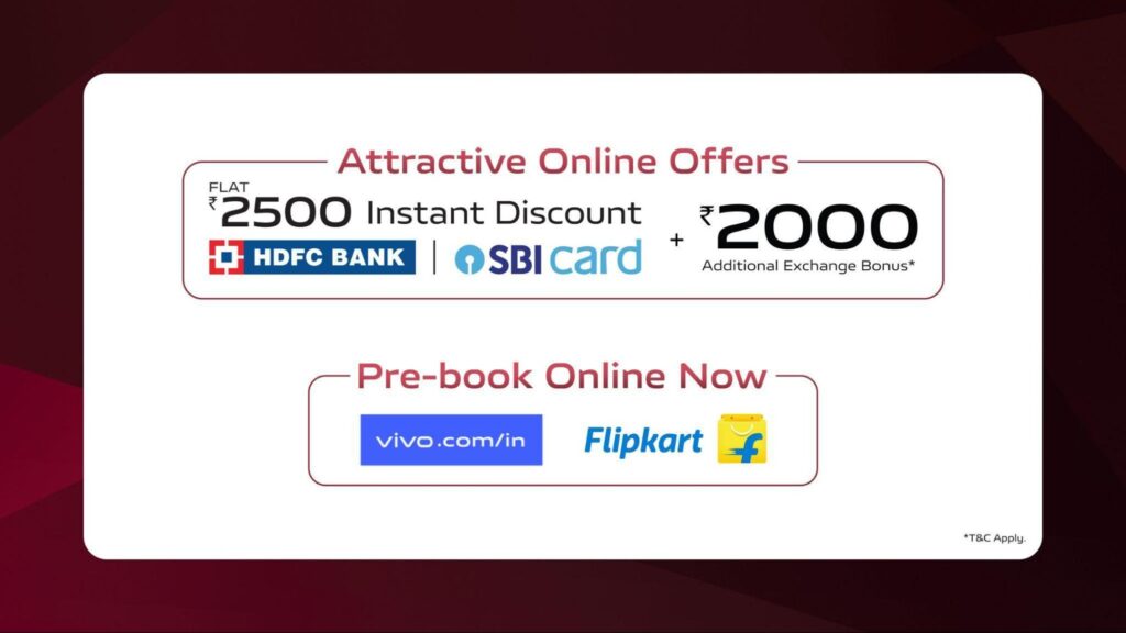 For those who pre-book online via Flipkart and vivo e-store using HDFC and SBI cards, an instant discount of Rs 2,500 awaits, along with an additional exchange bonus of Rs 2,000. Mainline store pre-bookings come with up to 10% cashback using ICICI, SBI, HDB Financial Services, and One cards, as well as an upgrade bonus of up to Rs 2,500.