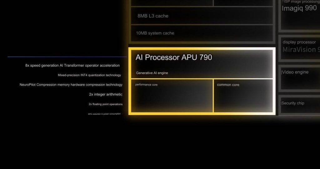 - NPU: The chipset also brags to be the “World’s 1st hardware-based Generative AI Engine with secure, personalized AI”. This is thanks to the underlying MediaTek APU 790.