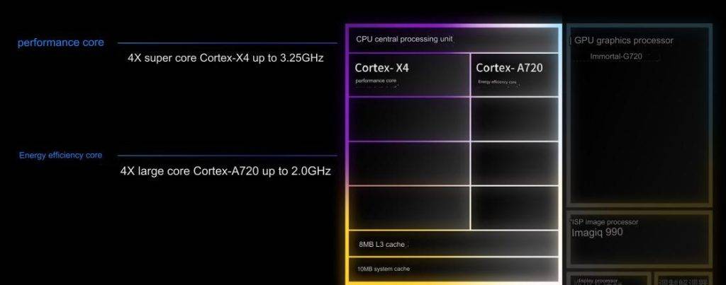 - GPU: It is a 12-core Immortalis G720 GPU that is said to be 46 percent better at ray-tracing and 45 percent more power saving.