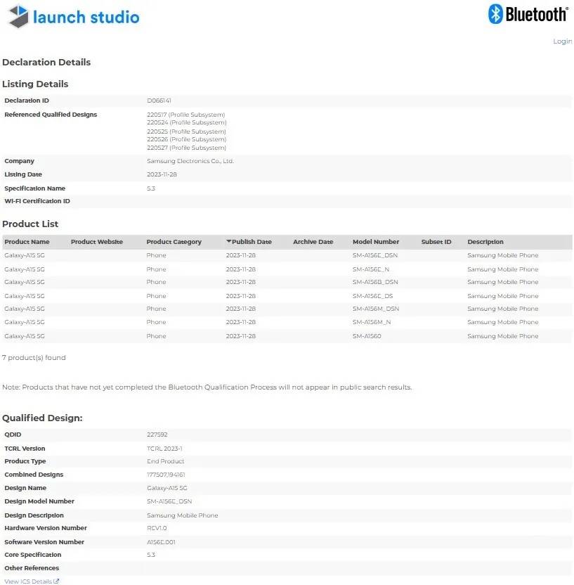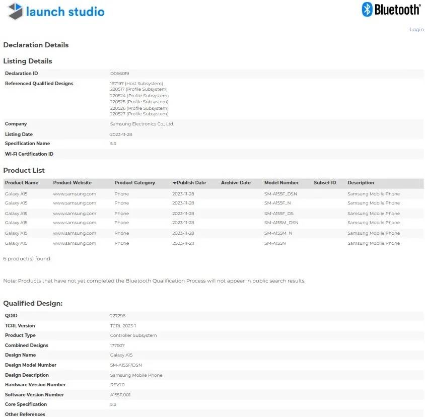 Samsung Galaxy A15 4G with model numbers SM-AISSF_DSN, SM-AISSE_N, SM-4155FDS, SM-AISSM_DSN, SM-AISSM.N, and A15 5G with model numbers SM-AISGE_DSN, SM-AISGE_N, SM-ASSB_DSN, SM-ASSE_DS, SM-AISEM_DSN, SM-AISEM_N, and SM-AISSO have been spotted by MySmartPrice on the Bluetooth SIG website.