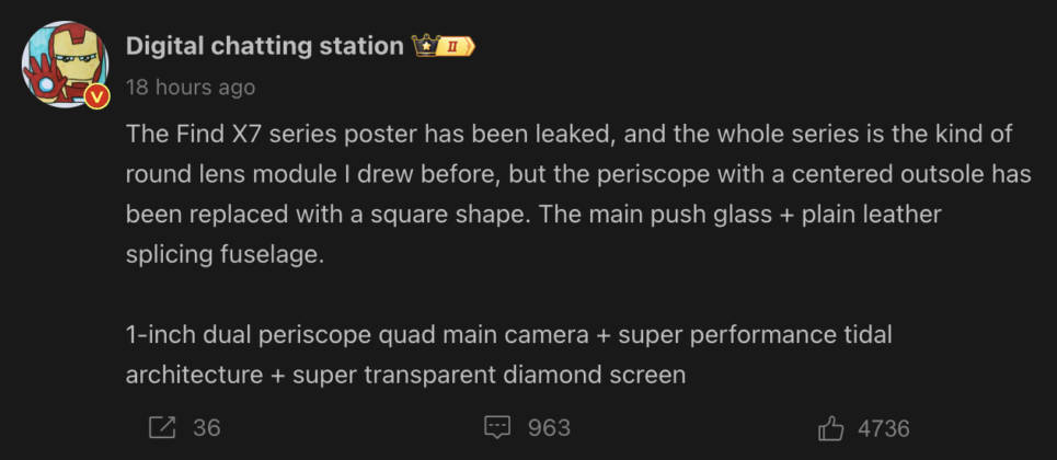 We also see the Find X7 Pro/Ultra’s quad camera setup in this image. Meanwhile, DigitalChatStation has claimed the following camera specs: