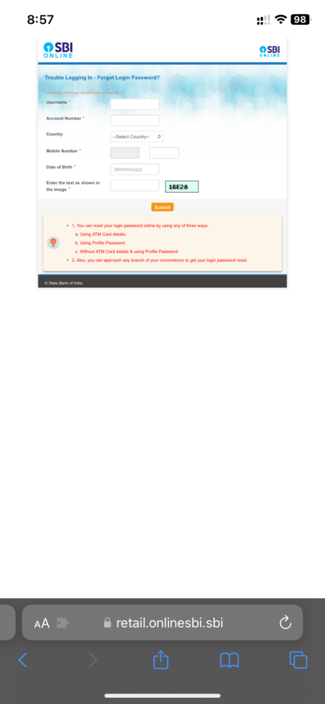 Step 5: Enter the username, account number, country, mobile number, date of birth and finally the captcha in their respective boxes. Tap on Submit once you fill all the boxes.
