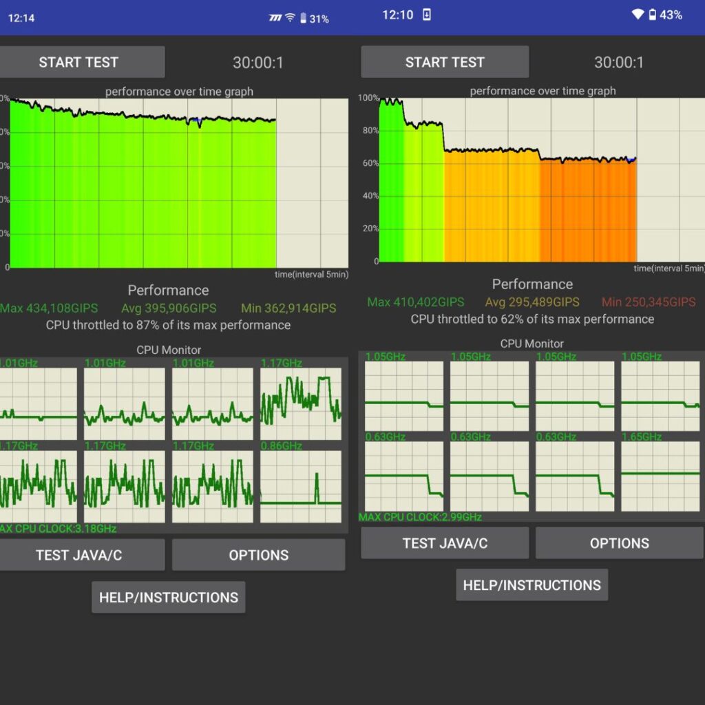 In the CPU throttle test, the iQOO Neo 9 Pro exhibits impressive stability and throttles down to 87 percent of its maximum performance. What was surprising, however, is that the Nothing Phone (2) dropped to 62 percent of its maximum performance. It is likely due to the thermal throttling, as the Nothing device heated up significantly during testing. The iQOO Neo 9 Pro also emerges as the winner in this CPU throttle comparison.