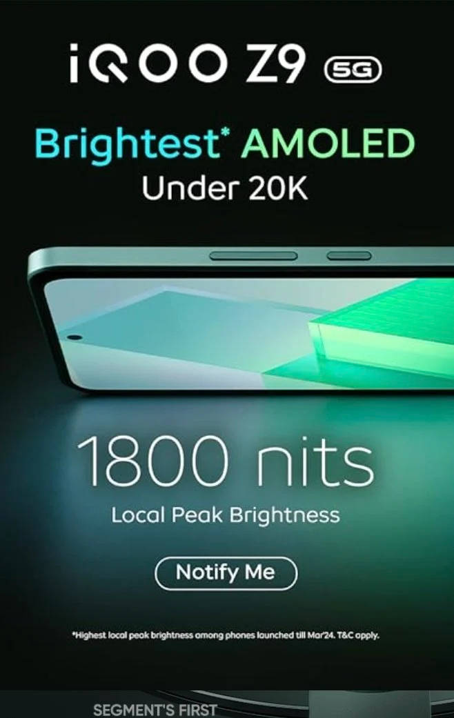 iQOO Z9 5G is set to launch in India on March 12th. While we wait for the announcement, the company has been teasing and revealing newer details of the phone, including the cameras. Now, in the latest promotional images, iQOO Z9 5G display hardware and battery capacity have been confirmed. Interestingly, the display poster also hints the price of the phone will be around Rs 20,000.