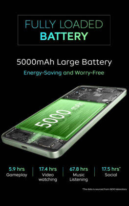 - The latest teaser images confirm the iQOO Z9 will come with a 5000mAh battery, which is claimed to offer 5.9 hours of gaming time and 17 hours of video watching.