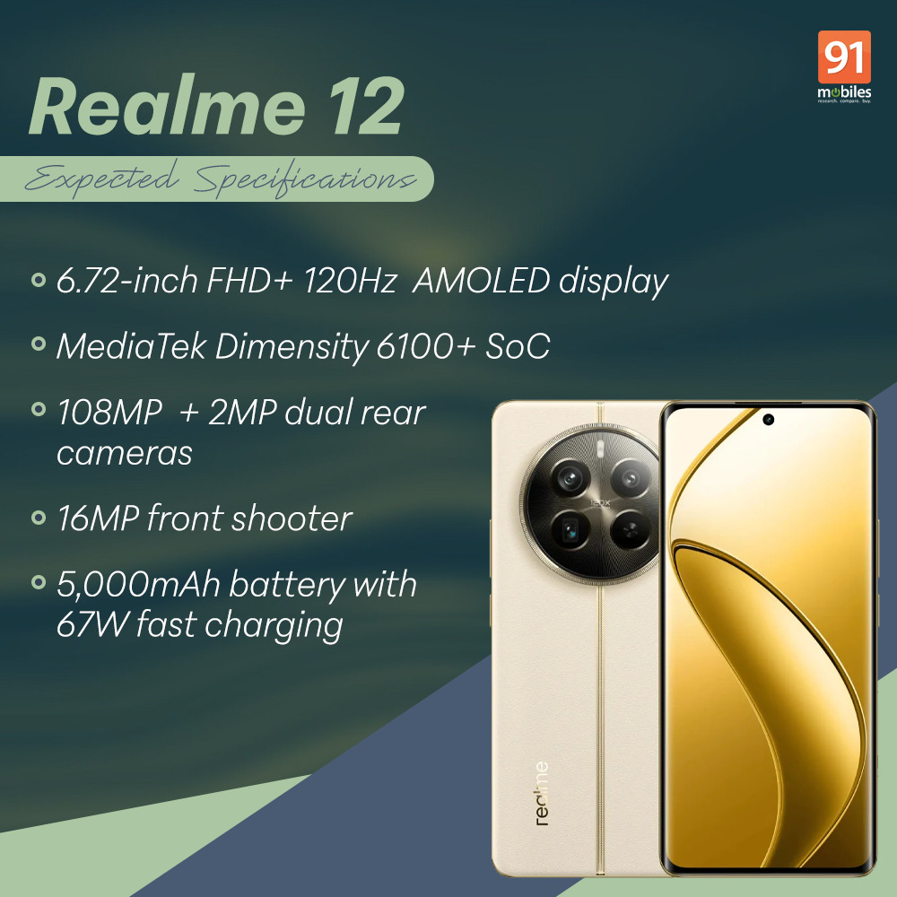 - Display: The Realme 12 5G could come with a 6.72-inch FHD+ AMOLED display with a 120Hz refresh rate.