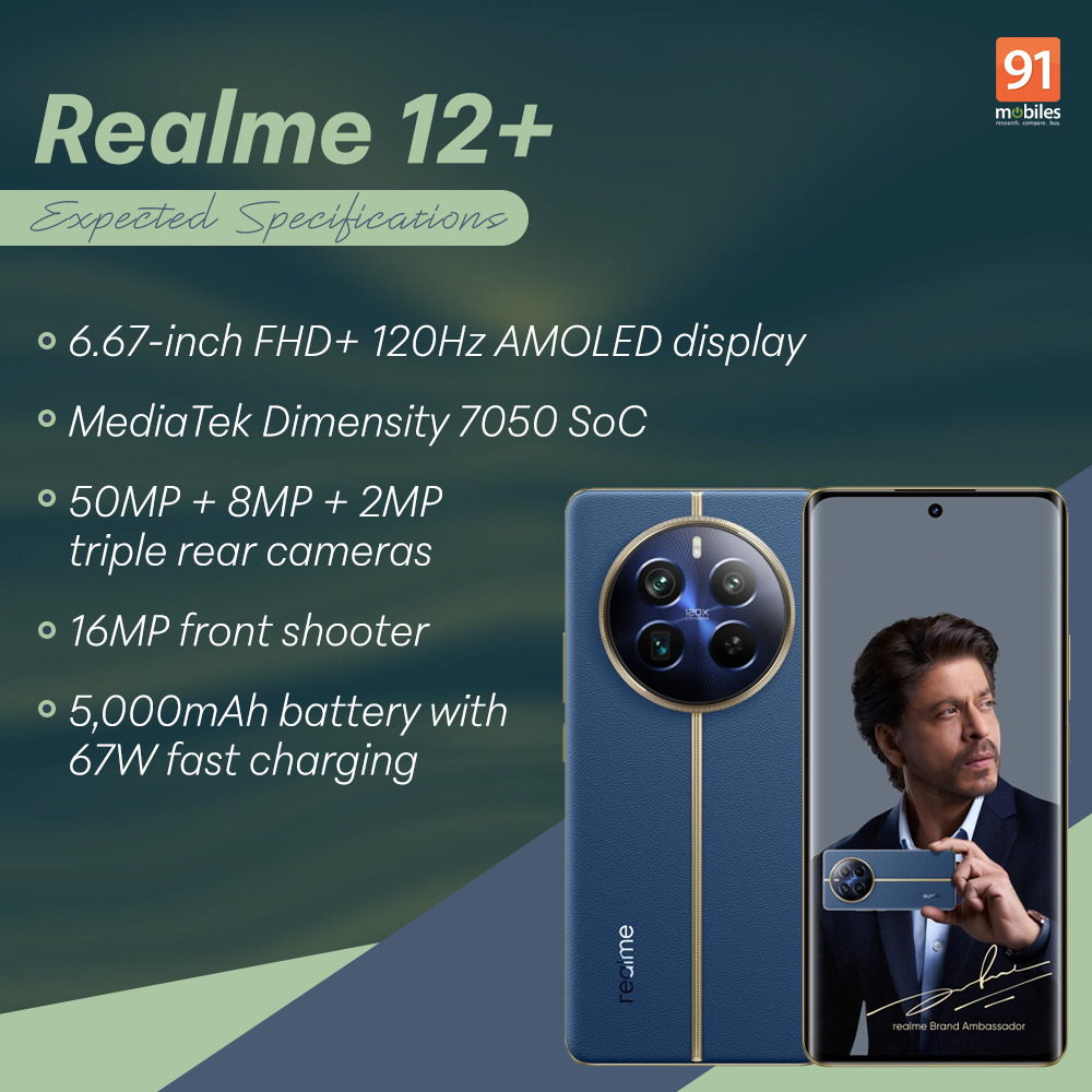 - Display: The Realme 12+ 5G could come with a 6.67-inch FHD+ AMOLED display with a 120Hz refresh rate.