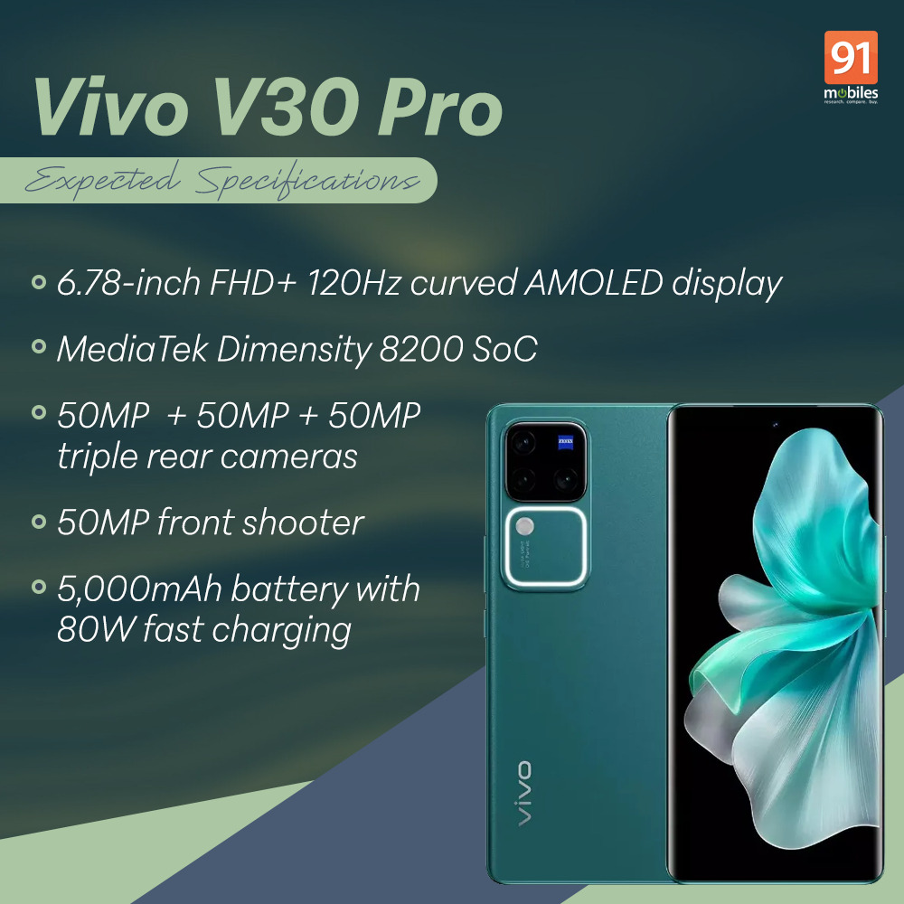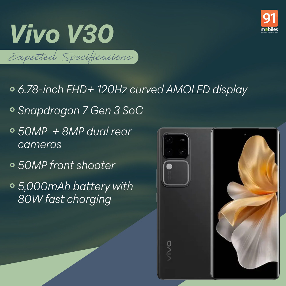 - Display: The Vivo V30 5G is likely to come with a 6.78-inch FHD+ AMOLED display with a 120Hz refresh rate and up to 2,800nits peak brightness. It comes with HDR10+ support.