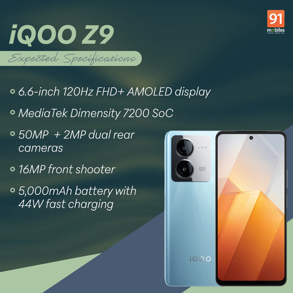 - Display: The iQOO Z9 5G could sport a 6.6-inch FHD+ AMOLED display with a 120Hz refresh rate.