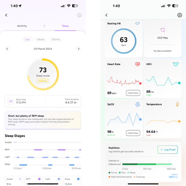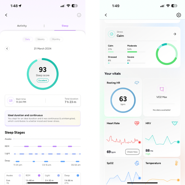 When you dive into the ring data though, the app experience seems much better. The data is presented well, with easy-to-understand visuals, scores, charts, and trends. The data panel shows the ring battery level up front and a sync now button, followed by data on sleep, activity, and vitals. Vitals cover resting heart rate, VO2 Max, heart rate, HRV, SpO2, and skin temperature, displayed in a card layout. Tapping on each displayed more details and trends. The sleep score and activity score are aided by short but useful pieces of info indicating how that score might affect your day. Like this one for instance: “Short, but plenty of deep sleep. You slept for less than ideal time, but it was good, deep sleep, which is associated with improved immune function.”
