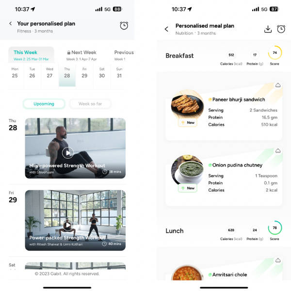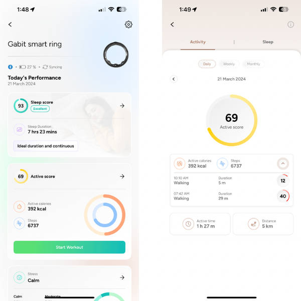 However, there’s a lot of info and visuals packed into that home tab, including the option to log food, choosing your health goal, details on paid subscription plans, user testimonials, some workouts, details of Gabit coaches, and more. With so much going on, the app might seem a bit overwhelming at first. Also, the ring data doesn’t sync with platforms like Google Fit and Apple Health at the moment. A recent update has added a small icon on top of the home tab for the user to jump directly to the ring data, but I think it deserves a tab of its own.