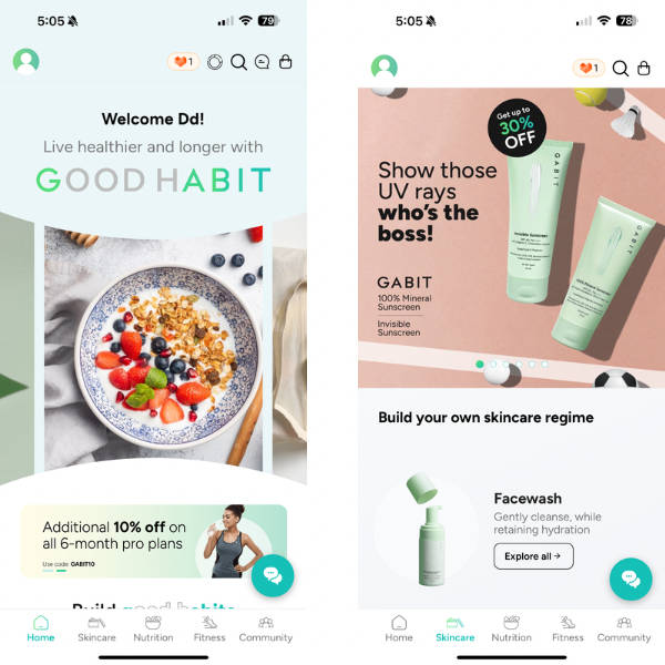 Speaking of the companion app, Gabit offers a homonymous one on both iOS and Android platforms. The app experience is critical for any wearable, and even more so in the case of a smart ring. Since the user can’t interact with the ring, and there’s no way for the latter to offer any feedback, the app is the gateway to everything this particular segment has to offer. And in case of Gabit, the app is possibly one of its best features. But also a cause of concern. For one, the app has a lot going on, with its interface categorised into tabs — home, skincare, nutrition, fitness and community. The data captured by the ring is available on the home tab, though you need to scroll a bit to find it.