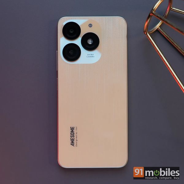 - With its 187-gram weight, the handset is comfortable to hold, and its flat edges provide a solid grip. The handset has been fashioned out of plastic, which doesn’t creek and cracks when the pressure is applied. The phone’s rear cameras are aligned in individual rings in the top right corner that juts out of the frame. A contrasting shade around the camera module adds to the device’s aesthetic appeal. Also, catching the attention is the ‘AWESOME’ text etched on the back panel of the device.