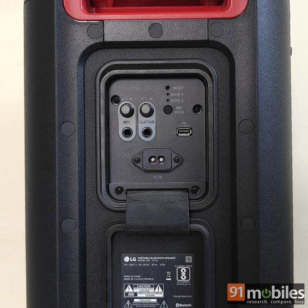 The front end of the speaker sports a metal grille, while the edges flaunt XBOOM branding and a nice texture, creating a striking contrast. In addition to the bottom edge, there are a few anti-skid pads on the left spine should you want to place the speaker horizontally. All the controls are on the top edge along with that handle, whereas the rear end of the speaker is equipped with a flap that opens to reveal I/Os, including a USB Type-A port for storage devices like a USB flash drive, as well as a couple of 6.5mm jacks to connect a guitar and microphone for karaoke nights. The flap securely attaches magnetically to the back of the speaker, preventing it from hanging loosely. Another well-thought-out aspect of the XL7S is the small pocket on the rear panel for storing smartphones or other compact items.