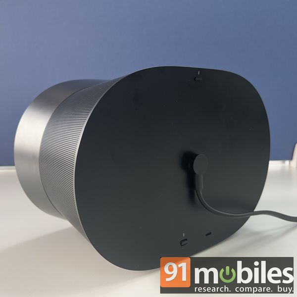 The top edge of the Era 300 boasts touch controls to pause/ play music and change tracks, and are fairly responsive. Additionally, there’s a beautifully carved indentation for adjusting volume levels, along with integrated microphones for voice control. The back panel features a Bluetooth pairing button and a toggle for voice commands, as well as a couple of ports for power and a Type-C connector.
