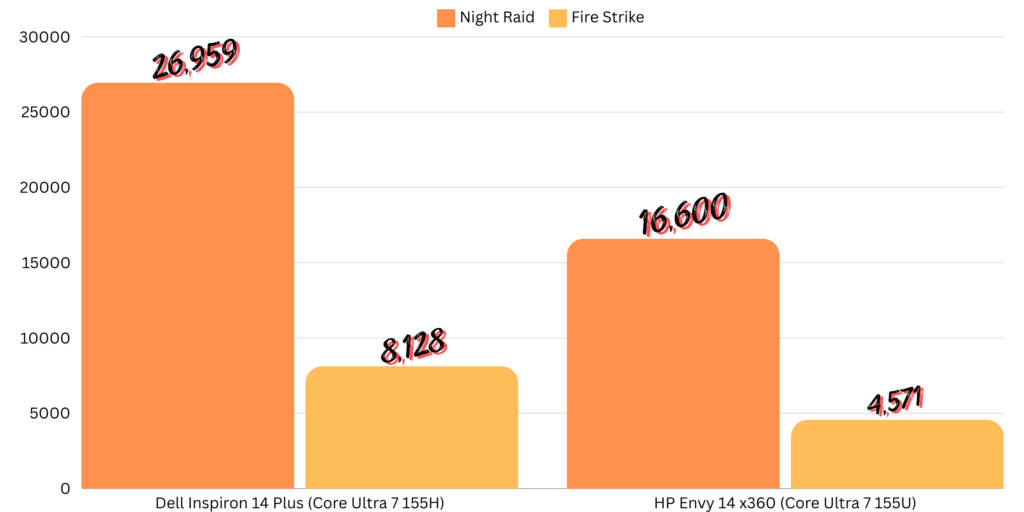 My findings were further substantiated when I ran various synthetic benchmarks on the laptop. In CineBench’s single-core and multi-core runs, the Inspiron 14 Plus overturned much higher numbers than the similarly-priced Envy 14 x360, which is powered by the Core Ultra 7 155U processor. Understandably, the laptop’s Arc GPU logged higher scores than the Envy’s integrated GPU, too, which has fewer Xe cores and a lesser max dynamic frequency.