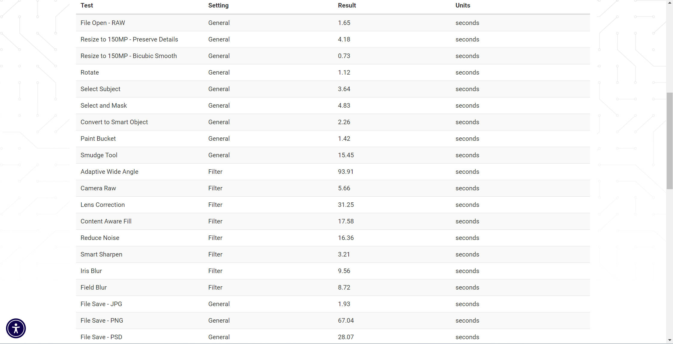 I also ran PugetBench on the device, which should help you assess the laptop’s photo and video-editing capabilities. The application performs a series of real-world tests on the host application (PhotoShop, in my case) and overturns a final score. The tests are designed to simulate actual workflows used by creators, such as applying the adaptive wide angle or lens corrective filter. Here, the device overturned a higher score than competing notebooks, too.
