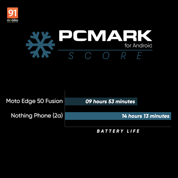 The Motorola Edge 50 Fusion lasted all of 9 hours and 53 minutes, while the Nothing Phone (2a) registered a substantially better battery life of 14 hours 13 minutes. The Motorola Edge 50 Fusion’s battery life is towards the lower end of its price segment. The result implies that the Nothing Phone (2a) should offer better battery life and screen-on time.