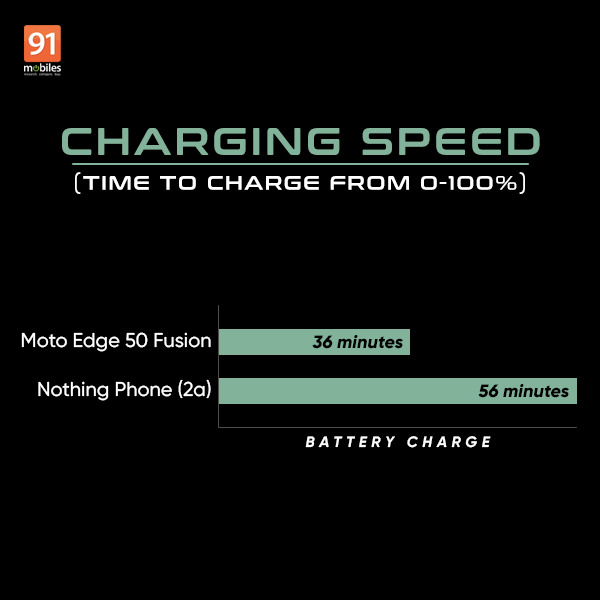 The Motorola Edge 50 Fusion comes with 68W fast charging support, compared to 45W fast charging support on the Nothing Phone (2a). With the ‘Charge boost’ option enabled, the Motorola Edge 50 Fusion takes 36 minutes to recharge completely from 20 percent to 100 percent. The device takes 54 minutes to recharge from 20 to 100 percent with the feature disabled. The Nothing Phone (2a) does not come with a similar feature and takes around 56 minutes to recharge completely from 20 percent to 100 percent. The Motorola Edge 50 Fusion wins when it comes to charging speed.