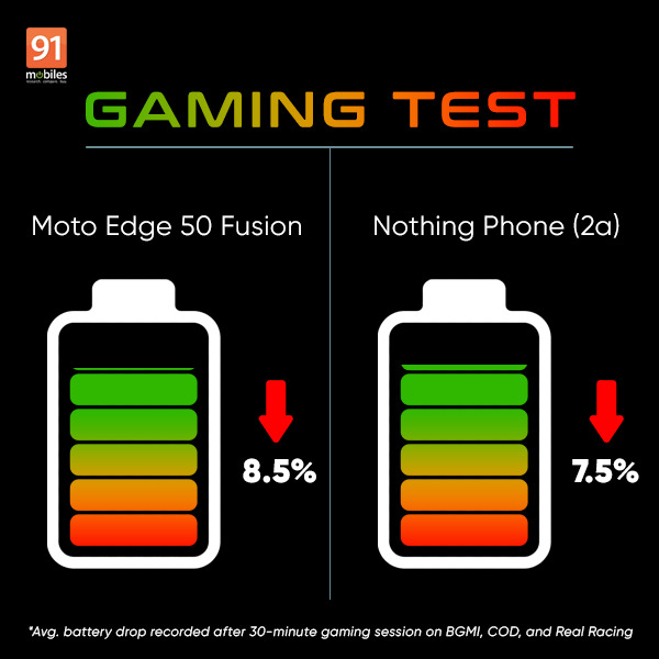 For the game test, we played three graphically demanding games, including BGMI, COD: Mobile and Real Racing 3 on both phones for 30 minutes for each game. At the end of the test, the Motorola Edge 50 Fusion showcased a total battery drop of 26 percent (8.5 percent average drain), while the Nothing Phone (2a) dropped a total of 22 percent (7.5 percent average drain). The Nothing Phone (2a) also wins the gaming test.