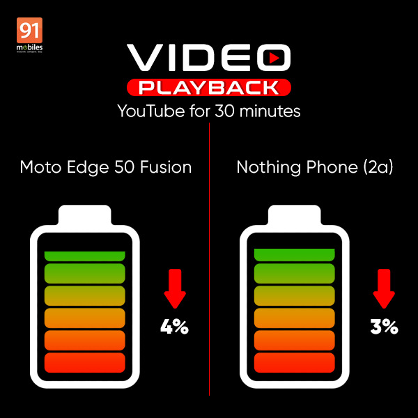 For the streaming test, we played the same YouTube video on both devices at 50 percent brightness and volume level for 30 minutes each. At the end of the test, the Motorola Edge 50 Fusion registered a battery drop of 4 percent, while the Nothing Phone (2a) registered a battery drop of 3 percent. The Nothing Phone (2a) once again wins the comparison with a slight edge.