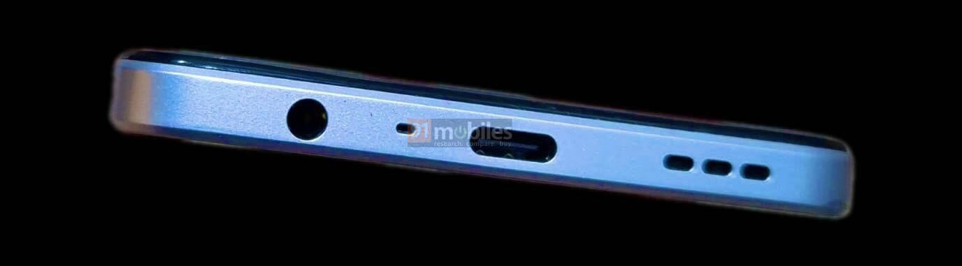 - The bottom side has a 3.5mm headphone jack, a microphone slit, a USB-C port, and a speaker grille.
