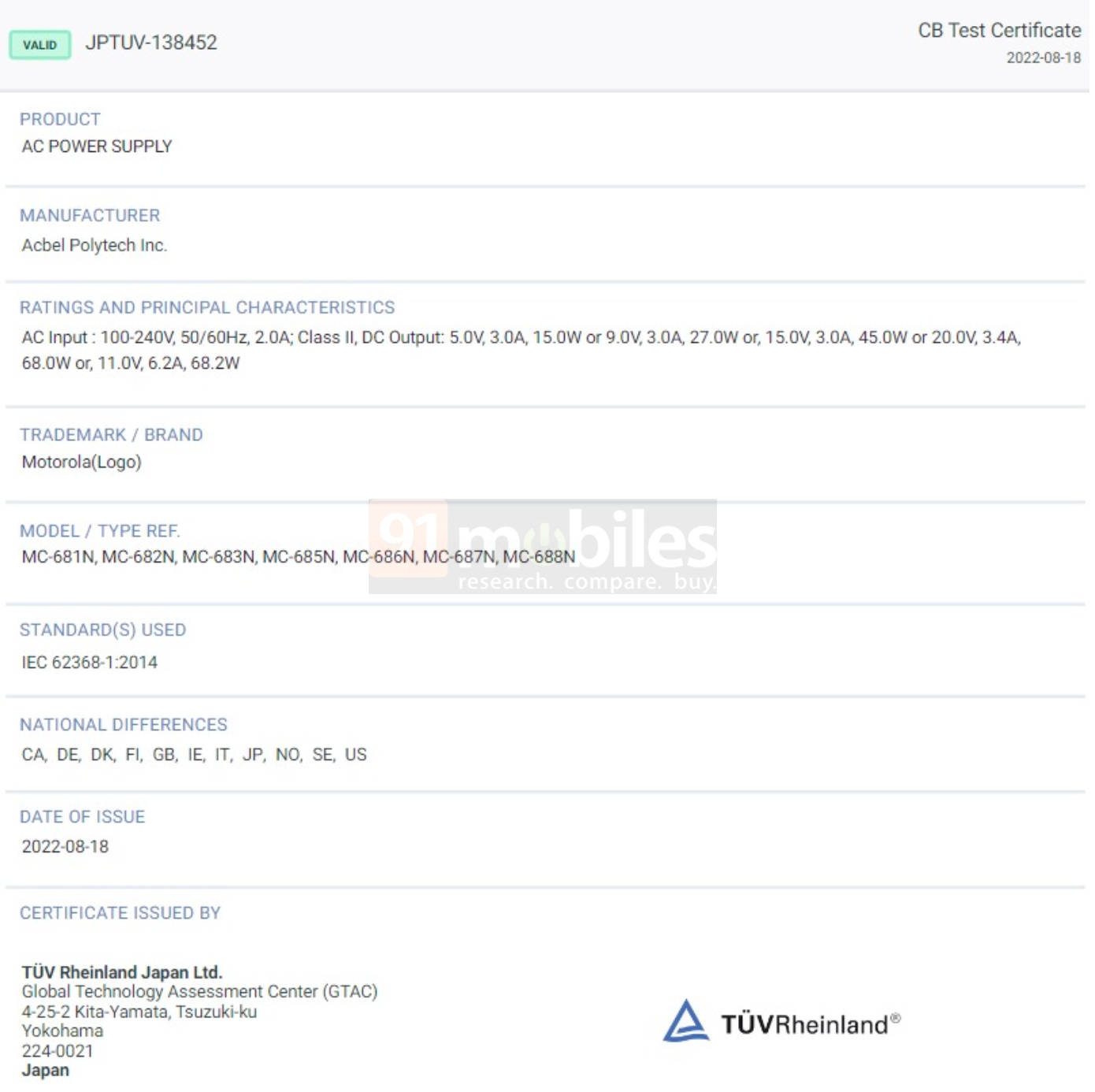 - The same has been listed on the TUV Rheinland website with the maximum power output as 68.2W. Motorola will most likely market this as a 68W charging adapter for the Razr 50 Ultra.