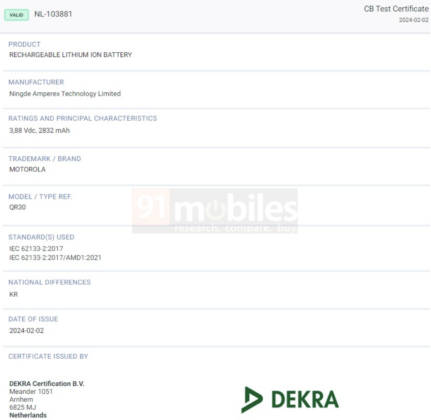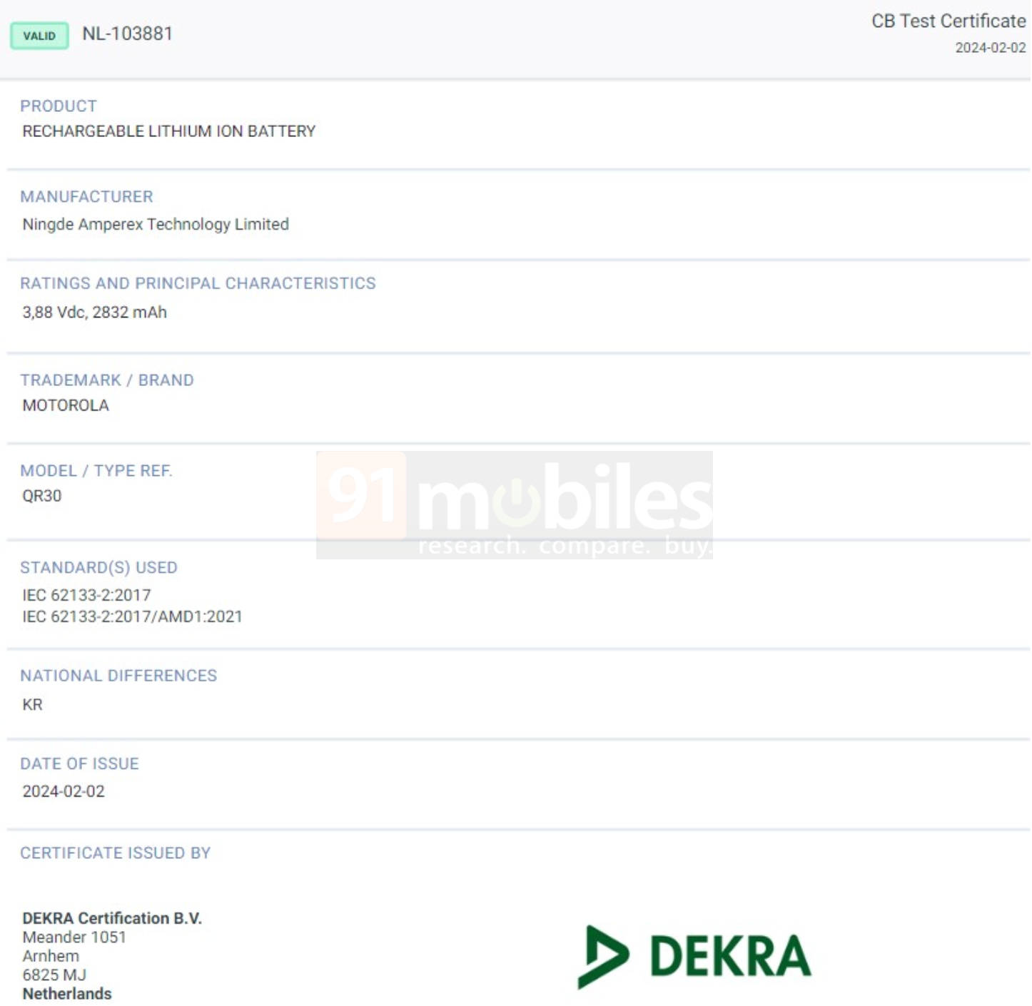 - The FCC and Dekra listings also hint at a 4,000mAh battery for the Razr 50 Ultra. It’s a dual-battery setup of 998mAh (QR10) + 2832mAh (QR30) when combined results 3830mAh. Motorola could market this as 4000mAh at launch, and the same was revealed through its TENAA listing as well.