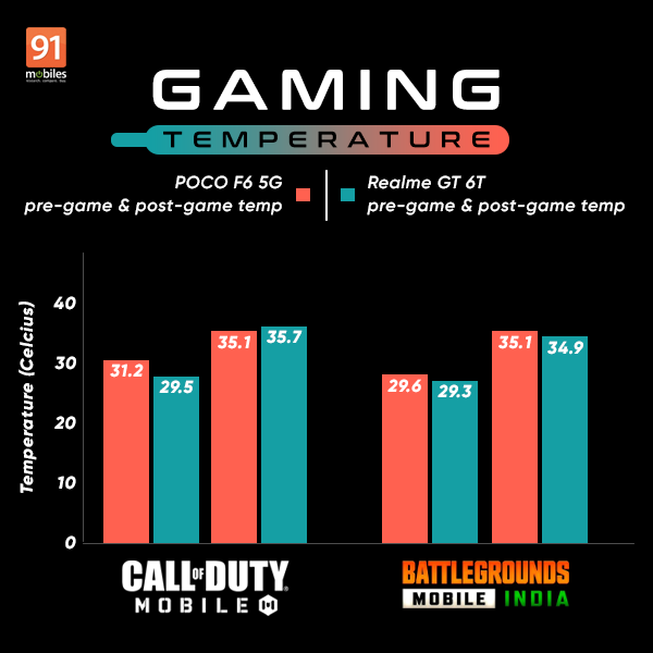 The comparison suggests that POCO F6 and Realme GT 6T are both exceptional mid-range smartphones with impressive performance. The handsets deliver similar performance when it comes to gaming, with no significant difference in heat management. However, if pure synthetic benchmarks are anything to go by, the POCO F6 emerges as a winner with higher AnTuTu and Geekbench scores.