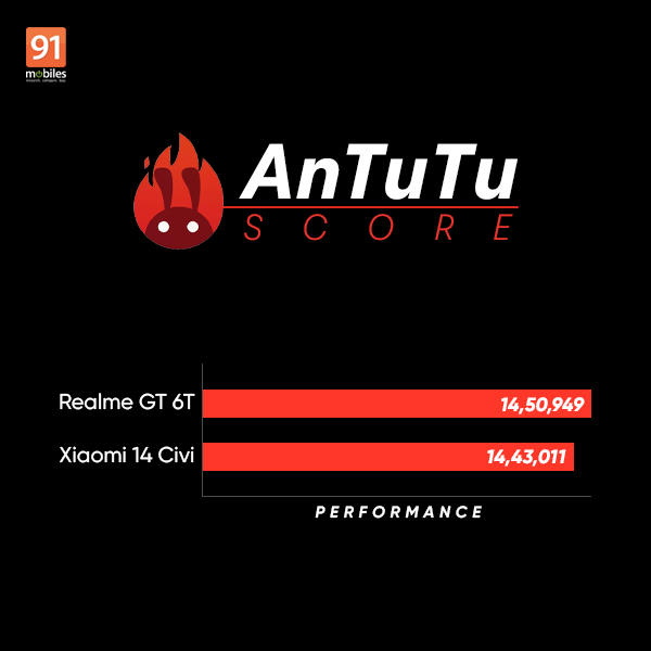 The Realme GT 6T narrowly won this round by achieving a significantly higher score of 14,50,949 on AnTuTu, compared to the Xiaomi 14 Civi’s score of 14,43,011. This means that the Realme smartphone should be slightly more capable of handling graphically demanding tasks such as gaming, multitasking, and more.