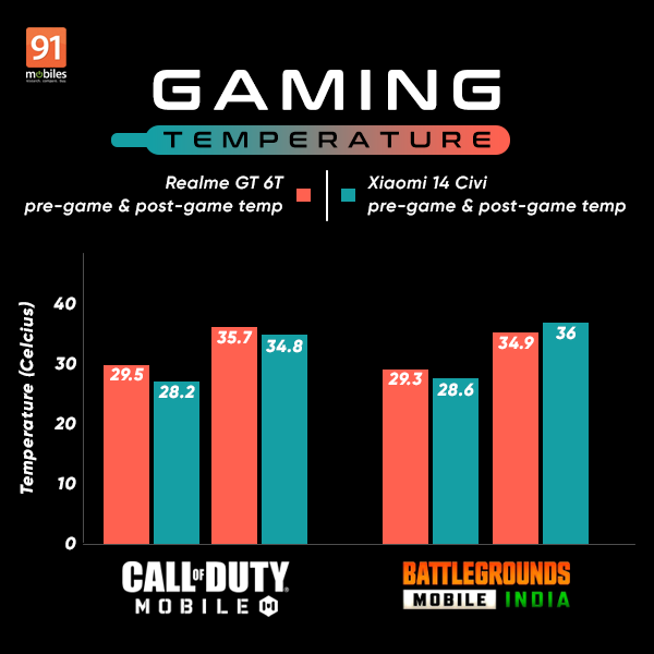 The gaming performance remains more or less the same on both devices. The Xiaomi 14 Civi and Realme GT 6T managed to run our go-to titles, namely Call of Duty and BGMI, fairly well. However, if you are wondering which smartphone is more efficient, then the Realme GT 6T is a clear winner. The handset’s thermals rose up by a cumulative 14.7 degrees after three games (each for 30 minutes). The Xiaomi 14 Civi, on the contrary, saw a 23-degree spike in its thermals after the test.