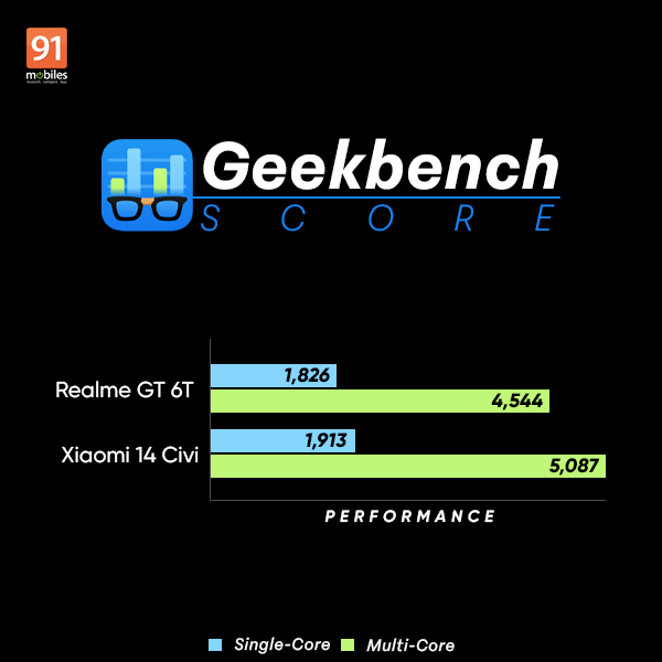 The Xiaomi 14 Civi outperforms the Realme GT 6T in the Geekbench test in both single-core and multi-core tests. While the difference in the single-core test scores between the two devices was relatively small, the Xiaomi smartphone won by a decent margin in the multi-core test. This should give the Xiaomi 14 Civi an edge over its counterpart when completing complex tasks.