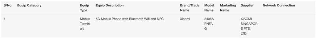 The IMDA listing (spotted by MySmartPrice) shows the phone’s model number as 2406APNFAG. This is confirmed to be the Xiaomi 14T by a recent IMEI listing.