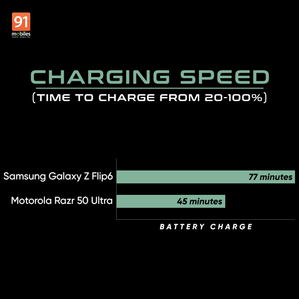 When it comes to charging, the Motorola Razr 50 Ultra takes 45 minutes to juice it up from 20 to 100 percent. In comparision, the Samsung Galaxy Z Flip6 takes about 77 minutes to achieve a full charge from 20 percent. This disparity is likely due to the slower 25W charging speed of the Samsung device compared to the 45W charging speed of the Motorola smartphone, which comes with a compatible charger included. The Samsung Galaxy Z Flip6 requires a separate purchase of a 25W PD charger.